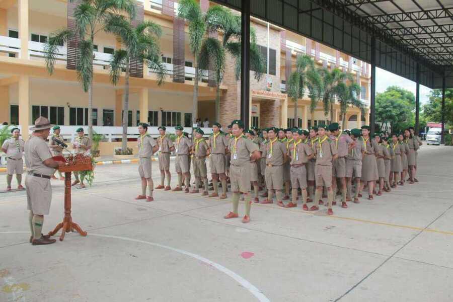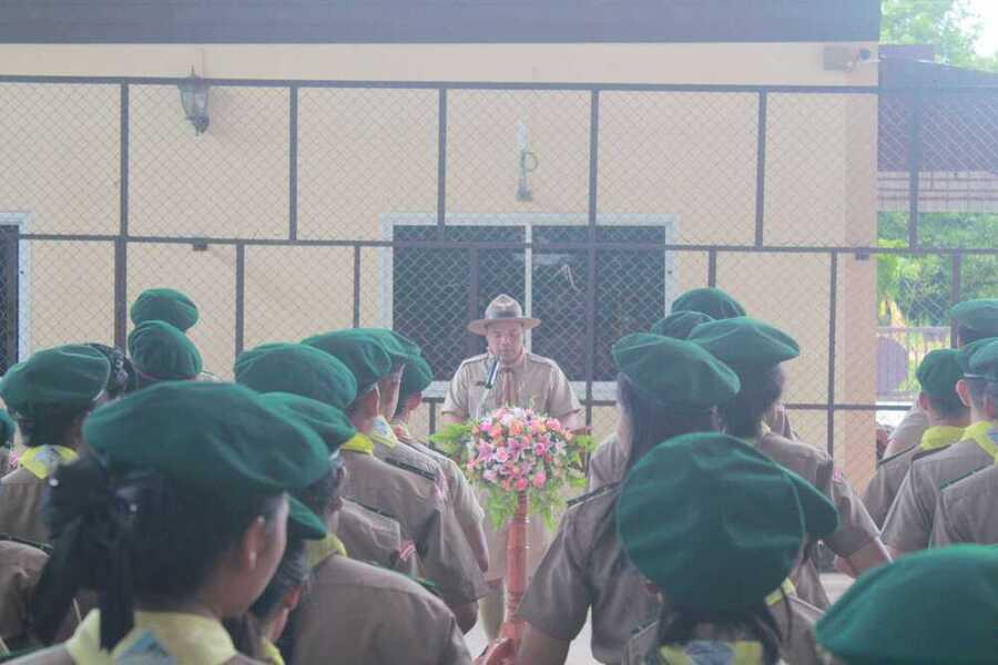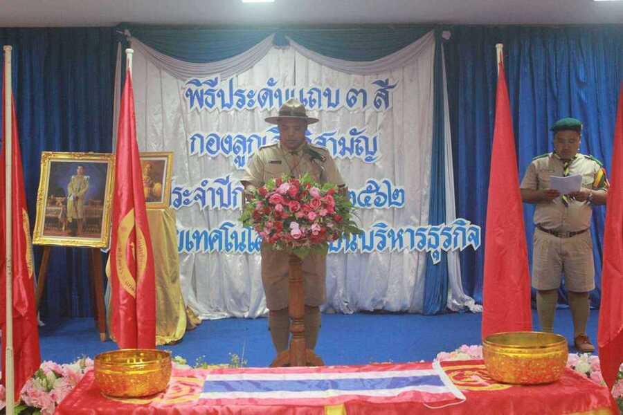 นายปราโมทย์ กล้าหาญ ผู้กำกับ และผู้ตรวจการลูกเสือวิสามัญ (A.L.T.C) เข้าร่วมเป็นประธานกล่าวให้โอวาท ในพิธีประดับแถบสามสี กองลูกเสือวิสามัญ วิทยาลัยเทคโนโลยีอาเซียนบริหารธุรกิจ (8 ส.ค. 61) S:0