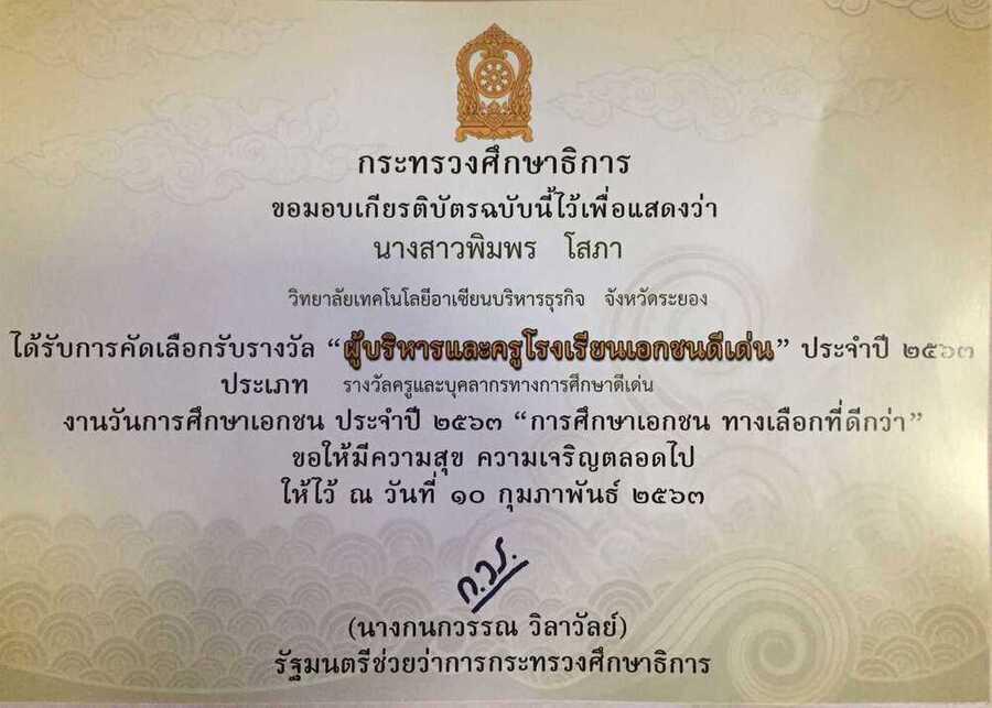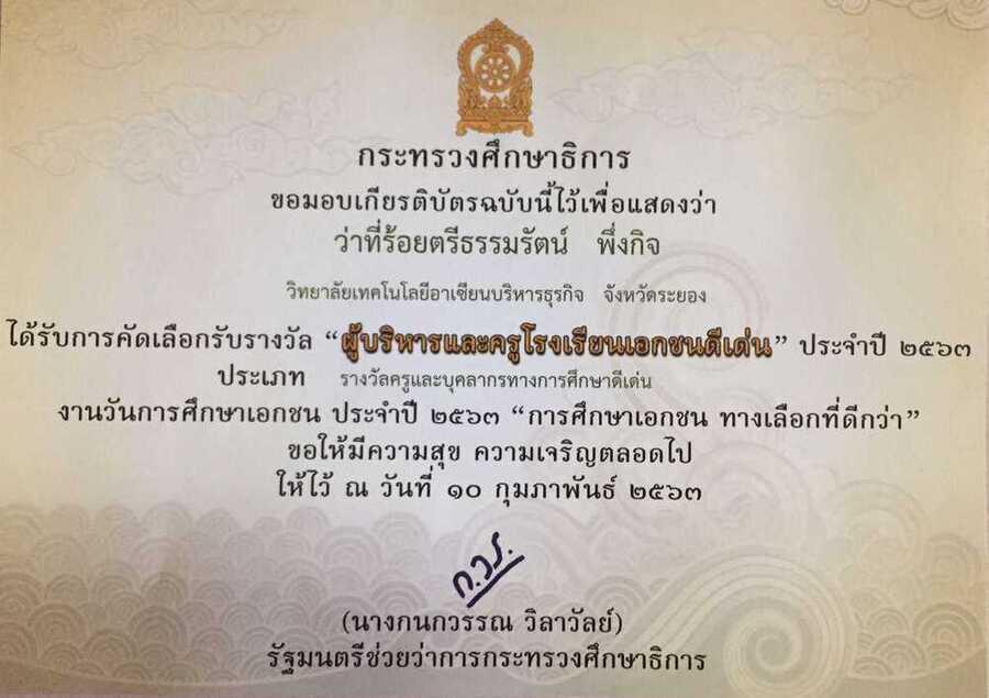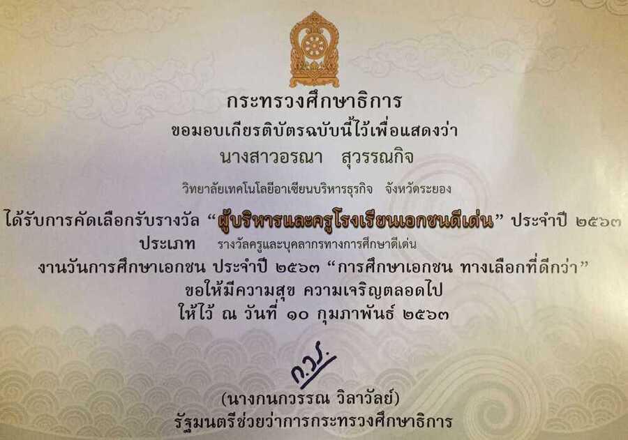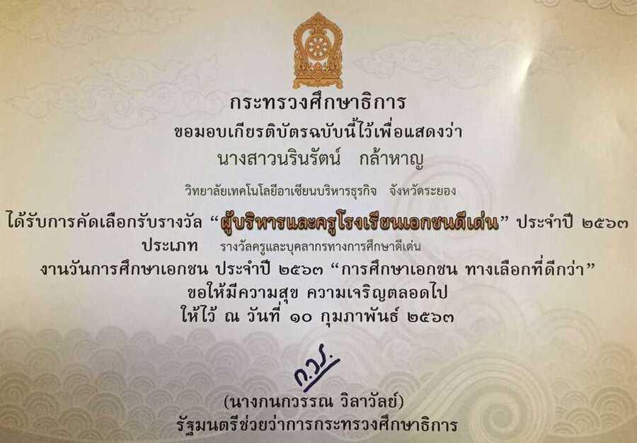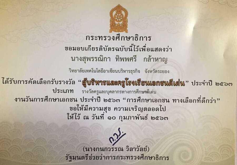 พิธีมอบเกียรติบัตรผู้บริหารและครูโรงเรียนเอกชนดีเด่น ประจำปีการศึกษา 2563 เมื่อวันที่ 16 กุมภาพันธ์ 2563 ผู้บริหาร คณะครู อาจารย์วิทยาลัยเทคโนโลยีอาเซียนบริหารธุรกิจ ได้เข้าร่วมพิธีมอบเกียรติบัตรผู้บริหารและครูโรงเรียนเอกชนดีเด่น ประจำปีการศึกษา 2563 และขอแสดงความยินดี กับนางสุพรรณิกา ทิพพศรี กล้าหาญ ผู้อำนวยการวิทยาลัยฯ, นางสาวนรินรัตน์ กล้าหาญ, นางสาวอรณา สุวรรณกิจ, นางสาวพิมพร โสภา และว่าที่ร้อยตรีธรรมรัตน์ พึ่งกิจ ที่ได้รับเกียรติบัตรในครั้งนี้ ณ อาคารราชนครินทร์ มหาวิทยาลัยราชภัฏราชนครินทร์ จังหวัดฉะเชิงเทรา S:0