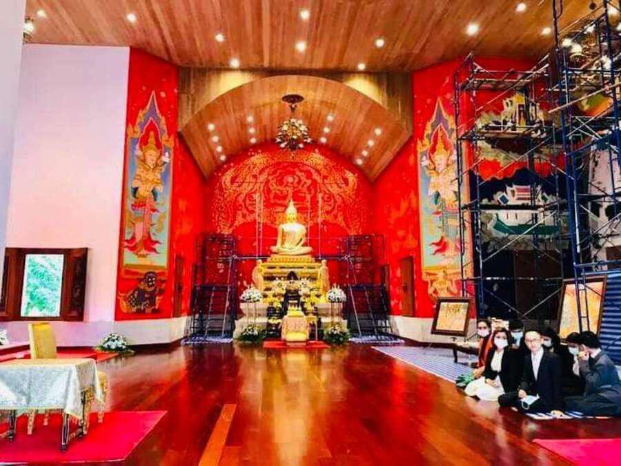 รับเสด็จพระเจ้าวรวงศ์เธอ พระองค์เจ้าโสมสวลี กรมหมื่นสุทธนารีนาถ ทรงโปรดให้ พระเจ้าวรวงศ์เธอ พระองค์เจ้าสิริภาจุฑาภรณ์ เสด็จแทนพระองค์ไปในพิธีบวรสรวงการบูรณะลงรักปิดทององค์พระประธานและงานเขียนภาพจิตรกร