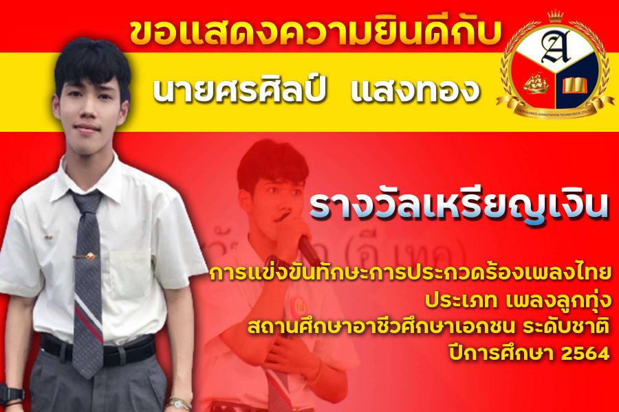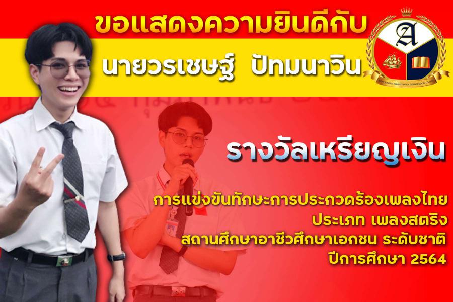 วิทยาลัยเทคโนโลยีอาเซียนบริหารธุรกิจ ขอแสดงความยินดีกับ นักเรียนที่เข้าร่วมการแข่งขันทักษะวิชาชีพ การประกวดร้องเพลงไทย ที่ได้รับรางวัล ดังนี้ การประกวดร้องเพลงไทย ประเภท การขับร้องเพลงพระราชนิพนธ์ - นางสาวไปรยา ม่วงโรง ได้รับรางวัลระดับ เหรียญเงิน???? การประกวดร้องเพลงไทย ประเภท การขับร้องเพลงสตริง - นายวรเชษฐ์ ปัทมนาวิน ได้รับรางวัลระดับ เหรียญเงิน???? การประกวดร้องเพลงไทย ประเภทการขับร้องเพลงลูกทุ่ง - นายศรศิลป์ แสงทอง ได้รับรางวัลระดับ เหรียญเงิน???? ในงานการแข่งขันทักษะวิชาชีพ สถานศึกษาอาชีวศึกษาเอกชน ระดับชาติ ปีการศึกษา ๒๕๖๔ ภายใต้สถานการณ์การแพร่ระบาดของโรคโควิด-๑๙ สมาคมวิทยาลัยเทคโนโลยีและอาชีวศึกษาเอกชนแห่งประเทศไทย ในพระราชูปถัมภ์ฯ สมเด็จพระเทพรัตนราชสุดาฯ สยามบรมราชกุมาร ณ วิทยาลัยเทคโนโลยีภาคตะวันออก (อีเทค) S:0