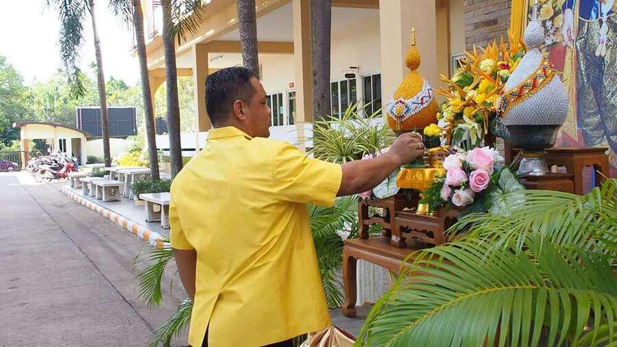 ประธานในพิธีถวายพานพุ่มสักการะ เบื้องหน้าพระบรมฉายาลักษณ์ พระบาทสมเด็จพระบรมชนกาธิเบศร มหาภูมิพลอดุลยเดชมหาราช บรมนาถบพิตร