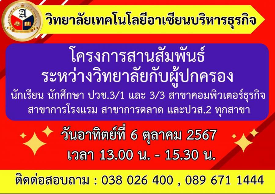 โครงการสานสัมพันธ์ระหว่าวิทยาลัยกับผู้ปกครอง ในวันอาทิตย์ที่ 6 ตุลาคม 2567 ช่วงที่ 1 ตั้งแต่เวลา 10.00 น. ? 12.00 น. นักเรียน นักศึกษา ระดับชั้น ปวช.1 และ ปวช.2 ทุกสาขา ช่วงที่ 2 ตั้งแต่เวลา 13.00 น. ? 15.30 น. นักเรียน นักศึกษา ระดับชั้น ปวช.3/1 และ 3/3 สาขาคอมพิวเตอร์ธุรกิจ, สาขาการโรงแรม, สาขาการตลาด และ ปวส.2 ทุกสาขา #สานสัมพันธ์ระหว่าวิทยาลัยกับผู้ปกครอง #เรียนดีมีความสุข #ABATC #วิทยาลัยเทคโนโลยีอาเซียนบริหารธุรกิจ ------------------------------------------------------ เปิดรับสมัครออนไลน์ เลือกสิ่งที่ชอบ กับสาขาที่ใช่ ใครยังไม่มีที่เรียน หรือ สนใจเรียนสายอาชีพ สำหรับนักเรียน นักศึกษา ระดับชั้น ปวช.และปวส. ทวิภาคี ภาคปกติ และ ทวิภาคี ตั้งแต่วันนี้เป็นต้นไป อยู่ที่ไหนก็สมัครได้ การศึกษาที่ดีเริ่มได้ที่ A-BATC #DEK68 สนใจติดต่อ 038 026 400, 089 671 1444 สมัครออนไลน์ ได้ที่ลิงก์นี้ https://forms.gle/szK6t6KMip6PWBPJ8 S:0
