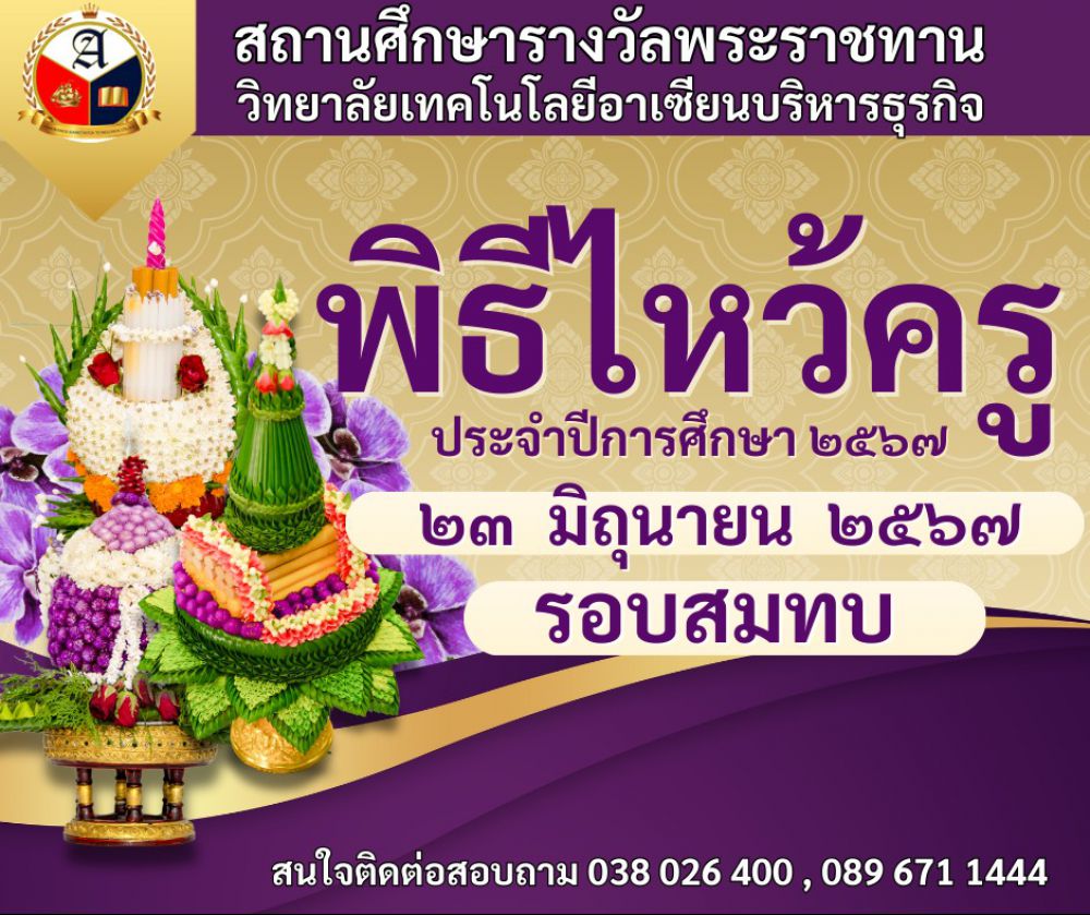 ?ปาเจราจะริยา โหนติ คุณุตตะรา นุสาระกา? พิธีไหว้ครู ประจำปีการศึกษา 2567 รอบเช้า วันที่ 20 มิถุนายน 2567 รอบสมทบ วันที่ 23 มิถุนายน 2567 **หมายเหตุ การแต่งกายด้วยชุดนักเรียน นักศึกษา ให้เรียบร้อย #วิทยาลัยเทคโนโลยีอาเซียนบริหารธุรกิจ #ABATC #DEK67 ---------------------------------------------- ?????เปิดรับสมัครออนไลน์????? ?เลือกสิ่งที่ชอบ กับสาขาที่ใช่ ใครยังไม่มีที่เรียน หรือ สนใจเรียนสายอาชีพ ยังเปิดรับอยู่นะ????? สำหรับนักเรียน นักศึกษา ระดับชั้น ปวช.และปวส. ทวิภาคี ?ภาคปกติ สมทบ และ ทวิภาคี? ????ตั้งแต่วันนี้เป็นต้นไป ???? อยู่ที่ไหนก็สมัครได้ ????? การศึกษาที่ดีเริ่มได้ที่ A-BATC ? #DEK67 สนใจติดต่อ 038 026 400, 089 671 1444 สมัครออนไลน์ ได้ที่ลิงก์นี้ https://forms.gle/RNpighxUySUhaK739 S:1