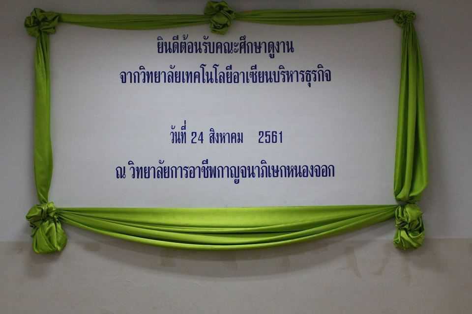 ท่านผูรับใบอนุญาต ท่านผู้อำนวยการ วิทยาลัยเทคโนโลยีอาเซียนบริหารธุรกิจ นำผู้บริหาร คณะครู อาจารย์ศึกษาดูงาน และขอขอบคุณ ดร.สมพร ชูทอง ผู้อำนวยการ วิทยาลัยการอาชีพกาญจนาภิเษกหนองจอก ที่ให้การอนุเคราะห์